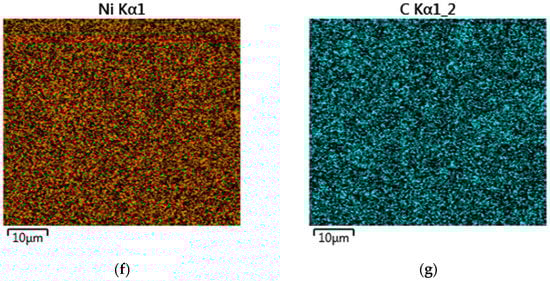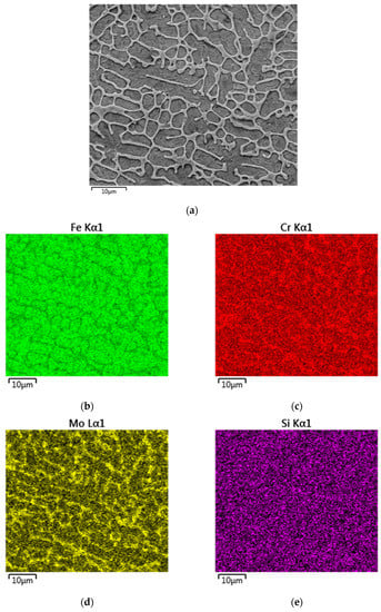 Figure 5 presents the mapping scanning results of 4.0 wt. % Mo coating. It shows that the microstructures are inhomogeneous due to the severe elemental segregation that occurs during solidification. As can be seen from Figure 5b, e , f, the Ni, Fe, and Si elements are evenly distributed in the matrix phase. The Mo, Cr, and C elements (showed in Figure 5c,d,g, respectively) are rich at the grain boundaries, which indicates that the microstructures of the grain boundaries are primarily carbides of Mo and Cr. EDS component analyses were done in this area, and the relative contents (wt. %) of the composition calculated are as follows: 72.7% Fe, 15.2% Cr, 4.6% Mo, 5.2% C, 0.7% Si, and 1.6% Ni.