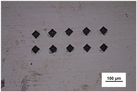 Figure 6 shows the morphology of the 4.0 wt. % Mo coating after the microhardness test. The size of the rhombus is basically the same, which indicates that the hardness distribution in the coating is uniform. The coating has good ductility because there are no obvious cracks around the indentations [41].