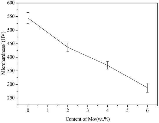 The microhardness test results of the coatings with different Mo contents are shown in Figure 7. The microhardness decreases with the increase of Mo content in the coatings. The microhardness of the 6.0 wt. % Mo coating is 288.0 HV, which is about half of the microhardness of the Mo-free coating. The XRD results show that the amount of M23(C, B)6 increases and the contents of M7(C, B)3 decrease with the addition of the Mo element. The microstructure analyses show that the martensite decreases and the ferrite increases gradually with the increase of Mo content in the coating. It is known from the literature that the microhardness of martensite is 525.4 HV and the microhardness of ferrite is 235.1 HV [42]. The microhardness of Cr23C6 is 13.2 GPa and the microhardness of Cr7C3 is 18.3 GPa [43]. Therefore, the microhardness of the coating decreases gradually with the increase of Mo content.