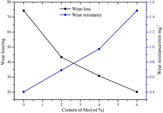 The wear loss and wear resistance of the coatings with different Mo contents are shown in Figure 8. The wear loss of the coatings decreases gradually with the increase of Mo content. The wear resistance of the 6.0 wt. % Mo coating is the best, which is about 3.7 times of that of Mo-free coating. Obviously, the addition of Mo in the stainless steel powder can greatly improve the wear resistance of the coatings.