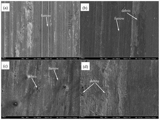 Worn surfaces of laser cladding coatings with different Mo contents: (a) Mo-free; (b) 2.0 wt. % Mo; (c) 4.0 wt. % Mo; (d) 6.0 wt. % Mo.