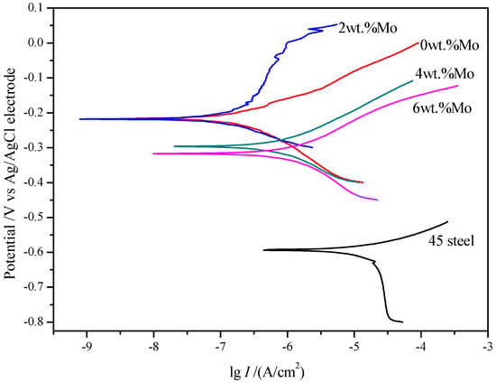 The potentiodynamic polarization curves of the coatings with different Mo contents and 45 steel substrate are shown in Figure 10. The potential for all of the coatings is higher than that of the 45 steel substrate, which indicates that the corrosion resistance of the 45 steel substrate is significantly improved by the coatings. Laser cladding is a rapid heating and cooling process. From the XRD results, it can be seen that complex chemical reactions take place and new phases generate during the solidification process. The addition of Mo will refine the microstructure of the coatings, which can improve the corrosion resistance of the coating. With the increase of Mo content in the coatings, the potential first increases and then decreases. The coating with 2.0 wt. % Mo has the best corrosion resistance. The reasons are as follows. When the corrosion test is carried out in NaCl solution, the Cl− will be adsorbed on the surface of the coating, which can react with the metal ion and form soluble chloride. This process can break the surface of the coating, and result in the formation of pitting (i.e., corrosion) on the surface of the coating. The addition of Mo can lead to a passivation phenomenon and greatly improve the pitting resistance of the coating [48]. When a certain amount of Mo is added in the coating, it can form a passivation film on the surface of the coating, which hinders the Cl− entering the coating. So the pitting of the coating reduces and the corrosion resistance improves. When the Mo content is too high, the corrosion resistance decreases. Through the mapping scanning analysis, it can be seen that the Mo element is mainly enriched at the grain boundaries. Such an uneven distribution reduces the corrosion resistance of the coating.