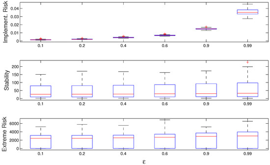 In terms of the convergence pattern for the algorithm, Figure 3 shows the evolution of the robustness to implementation risk as a function of the number of fitness evaluations for different values of . The data shows the average measure over 20 runs for the first time period. Larger tolerances to uncertainty regarding risk implementation require a more exhaustive search and, therefore, more evaluations. The improvement of the metric over time is quite dramatic. For lower values of , the indicator tends to stabilize around 3000 to 4000 fitness calls. When , the required number goes up to 6000–7000. This plot confirms the ability of the proposed fitness assignment procedure to continuously evolve the population with regard to robustness.