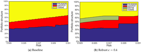 Finally, we look into an additional aspect, the structure of the found portfolios. Figure 4 presents the composition maps for the portfolios across different risk levels for the non-robust algorithm, Baseline, and the robust version with . More specifically, it represents the portfolios found for the first window, in the run already shown in Figure 2c. Instead of considering the whole range, we make the results more easily comparable focusing the attention on the central area between the lowest and the highest point in terms of risk where there is an overlap. Because the portfolios included in the solution are not evenly distributed and there is no perfect overlap in terms of risk, the comparison is performed based on the closest pairs of portfolios.