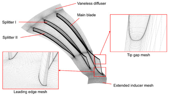 A multi-block structured grid is built to mesh the impeller. For the O4H topology of the impeller, it consists of 153, 69, and 43 nodes in the streamwise, spanwise, and pitchwise direction, respectively. The tip clearances of all blades are set constant to 4.4% of exit blade height. To predict a boundary layer resolution sufficiently fine for the Spalart–Allamaras model, a value of 0.001 mm is found appropriate for the first layer wall distance of the near-wall grid. The resulting local normalized wall distance y+ varies from 0 to 3. All fluid domains are calculated in the rotating reference frame, and thus no rotor–stator interfaces are needed. The final grid of the datum impeller has 2.3 million volume cells for single pitch, including around 0.2 million volume cells in tip gap regions. The final grid is shown in detail in Figure 4.