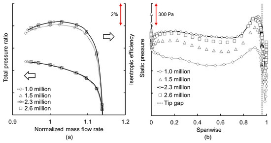 The accuracy of CFD results is associated with the grid size; therefore, the grid independence is studied before large amounts of simulations are carried out. Four different types of mesh within the impeller are investigated, whose number of nodes vary from 1.0 million up to 2.6 million. The resulting performance of all meshes at design speed is plotted in Figure 5a. It is illustrated that the CFD simulation produces consistent results when the mesh nodes surpass 1.5 million. In Figure 5b, the spanwise distribution of static pressure is compared at impeller exit, where all the cases share the same mass flow rate at the peak efficiency condition. The pressure distribution is reproduced for a mesh size of 2.3 million nodes and above, where the maximum difference of static pressure is only 0.03% of the backpressure. Hence, the numerical method that adopts a mesh with 2.3 million nodes is independent of the mesh resolution.