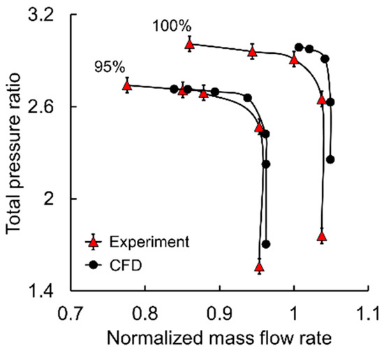 The characteristics of the datum compressor obtained from experiments and CFD are showed in Figure 7. To represent the maximum discrepancy among different tests on the same compressor, error bars are plotted in the experiment performance lines. The satisfactory agreement is obtained with respect to the choking flow prediction and the tendency of pressure curves, although there is inconsistency for surge point prediction. In this steady case, the surge point is defined as the converged point with the highest backpressure. However, it is misleading to deduce the time-dependent system oscillations from numerical steady-state instabilities. Moreover, the application of a rotor-stator interface model will influence surge point prediction as well. At the design speed of the datum compressor stage, instability is initiated from the vaned diffuser part. Since the mixing plane model is applied to the radial gap between the impeller and the vaned diffuser, the incoming flow condition of the vaned diffuser will be different from reality, which then introduces errors in surge prediction. At 95% design speed, because the origin of instability will be shifted from the vaned diffuser to the impeller when decreasing the operating speed [35], the impact of the mixing plane model will be reduced, and thus the discrepancy on surge point prediction will also be decreased. To avoid the impeller–diffuser matching issue as well as the application of a rotor-stator interface model, only the datum impeller attached with an extended vaneless diffuser is considered in the following research.