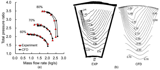 To further validate the numerical method for predicting performances and detailed flow fields of impellers with vaneless diffusers, the open transonic centrifugal compressor SRV2-O has been investigated applying the same numerical method. Its geometry specification has been given by Eisenlohr et al. [36] and its measurement results have been provided by Krain et al. [37]. The compared pressure curves are at 60%, 70% and 80% of design speeds, where the operating pressure ratios are similar to the investigated case. The compared flow field is taking from the m/mc = 0.89 operating point at design speed, where a strong shock wave occurs at the leading edge of the main blade. Figure 8a compares pressure curves of the SRV2-O compressor between experiments and CFD, where the CFD results agree well with the experiments. The comparison of relative Mach number near the inlet and the exit respectively is presented in Figure 8b. It is illustrated that both the shock position and the shock strength have been well captured at the tip section. The numerical method is therefore considered capable of predicting the compressor performance and the flow details near the peak efficiency condition, which is sufficient for the following discussions.