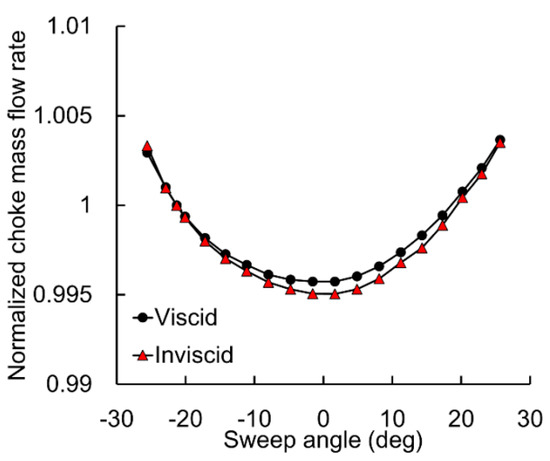 The choke mass flow rate of cases with different sweep angle is illustrated in Figure 9. It is observed that both forward sweep and aft sweep tend to increase the flow capacity, and the variation of the choke mass flow rate is 0.8% of that of the datum case. The choke flow capacity is decided by the throat area and the blockage factor. Because of the complexity of the investigated case with twin splitters, the impeller throat area is strongly three-dimensional and its variation trend can be well captured through inviscid simulations. By comparing the choke prediction through viscid and inviscid methods, it can be concluded that the change of the throat area rather than the blockage is dominant for the trend of choke mass flow rate. When the sweep angle decreases from 0° to −25°, the throat area will be generally enlarged due to the reduced space occupied by blades at upper spans. When the sweep angle increases from 0° to +25°, the induced inlet lean angle plays a more important role that turns the throat surface more perpendicular to the axial direction, and thus increases the throat area.