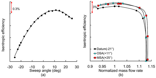 Efficiency: (a) trend with sweep angle and (b) design speed performance comparison. OSA: optimal sweep angle; MSA: maximum sweep angle.