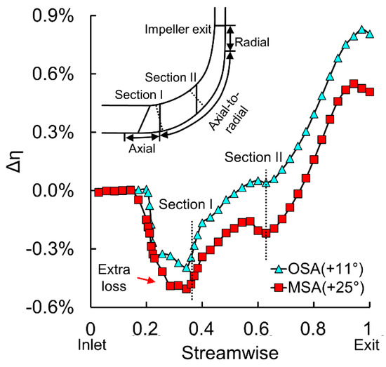 The streamwise Δη distribution of OSA and MSA cases is shown in Figure 11. From inlet to Section I near the leading edge of splitter I, Δη drops suddenly at first and finally increases quickly. The sudden changes of Δη are caused by the sweep of main blade leading edge, where the incoming flow encounters the leading edge and generates entropy at a more upstream location. The negative value of Δη at Section I is due to additional friction loss by the increased blade surface area. Comparing OSA with MSA, it is illustrated that the too large sweep angle induces extra loss near Section I, which is responsible for the efficiency drop from +11° to +25° of sweep angle. From Section I to Section II near the leading edge of splitter II, Δη increases gradually. From Section II to the exit, Δη increases at a much higher rate. Generally, the efficiency improvement focuses near the radial part of the impeller, although the blade modification by sweep is made near the axial part.