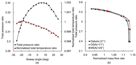 The pressure ratio of cases with different sweep angle is illustrated in Figure 13a. It is shown that the highest pressure ratio also occurs at the optimal sweep angle. The variation range of the pressure ratio is 1.2% of that of the datum case. Despite the lowered efficiency of other cases, the total temperature ratio, which can be used to evaluate the change of work input, is also examined in Figure 13a. The variation of the total temperature ratio is less than 0.2% of that of the datum case, which implies that the work input is barely changed by sweep. The work input will only be influenced by the blade turning angle and the slip factor. Since the blade angle distribution and the rear part of the impeller have been kept unchanged, barely changes are expected in both the blade turning angle and the slip factor, and thus the work input. The resulting design speed pressure ratio comparison between datum, OSA and MSA cases is presented in Figure 13b, where the change of pressure ratio is limited due to the relatively small change in efficiency and the nearly unchanged work input.