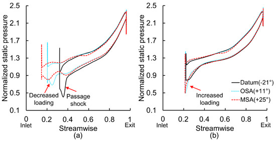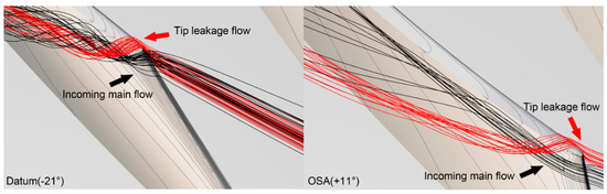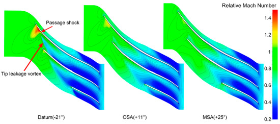 In the datum case, a weak passage shock followed by the tip leakage vortex trajectory can be observed from Figure 18. In the OSA and the MSA case, both the shock and the downstream low-momentum flow region are eliminated. The decreased shock strength is owned to both the extended chord length and the unloading effect of the tip section. Since the definition of sweep keeps the blade angle distribution along the relative chord length unchanged, the extended chord length by the enlarged sweep angle will decrease the blade turning at the front part, and thus the shock strength is decreased. Moreover, the unloading effect of the enlarged sweep angle lowered the streamwise pressure rise by the shock, which also inclines to decrease the shock strength. The reduced shock strength contributes to the reduced local shock loss. However, referring to Figure 11, the reduced shock loss in the front part is relatively limited compared to that in the rear part of the impeller.