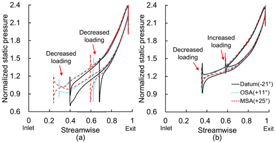 Static pressure distribution of splitters at (a) 95% span and (b) 5% span.
