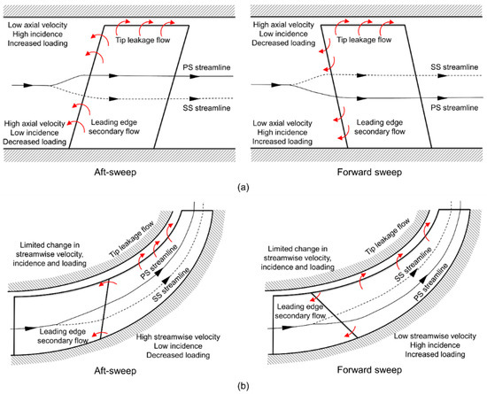 To understand sweep effects on the front loading of different blades, one of the explanations is given based on the streamline twist. For axial turbomachines and axial parts of centrifugal compressors, illustration of streamlines is shown in Figure 16a. When the blade is designed aft-swept, a secondary flow that drives the fluid from the pressure side (PS) across the leading edge to the suction side (SS) exist, which works in similar fashion with the tip leakage flow. The leading edge secondary flow is generated by the local pressure gradient, where the incoming flow pressure is lower than the pressure side pressure and higher than the suction side pressure near the leading edge. As a result, the suction side and pressure side streamline will be twisted radially inward and outward, respectively. The axial velocity at suction side near the hub will therefore be higher, which leads to a lower incidence and a decreased loading. The axial velocity at suction side near the tip will be lower, which results in a higher incidence and an increased loading. When the blade is designed forward swept, it can be deduced in a similar manner that the front loading near the hub will be increased, while that near the tip will be decreased.