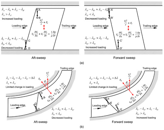 Equation (7) reveals that the loading gradient mainly depends on the tangential velocity of the incoming flow, which does not change with the sweep angle. Comparing Equations (3) and Equations (4):