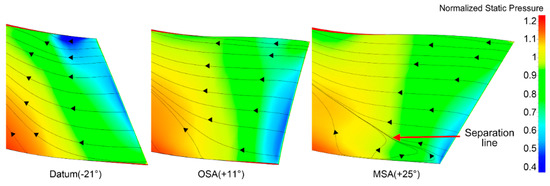 The CFD results of efficiency with different sweep angle are presented in Figure 10a. When the sweep angle is gradually enlarged from −25° to +11°, the efficiency tends to be increased by 1.2%. The efficiency decreases moderately by 0.2% when the sweep angle further increases from +11° to +25°. The optimal sweep angle at +11° and the maximum sweep angle at +25° are referred as OSA (optimal sweep angle) and MSA (maximum sweep angle) respectively. The resulting design speed efficiency comparison between datum, OSA and MSA cases is presented in Figure 10b. It is observed that a 0.8% increase in efficiency occurs at the whole speed line of OSA. The high mass flow conditions of MSA are similar to OSA, but a deficit of 0.2% in efficiency occurs at low mass flow conditions.