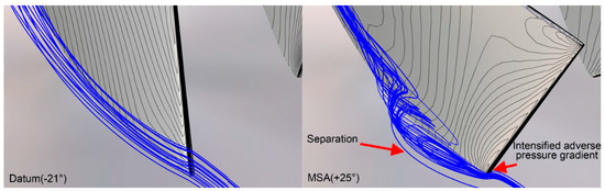 The above equivalent explanations support most of the loading changes in Figure 15 except for the hub loading of splitter I. Since all blades sweep together in the current investigation, the upstream swept blades will influence downstream blades. When increasing the sweep angle, the increased hub front loading of the main blade leads to a thickened boundary layer or even flow separations near the pressure surface, which reduces the channel diffusion ratio and decreases hub incidence of splitter I. Its hub loading is therefore decreased.