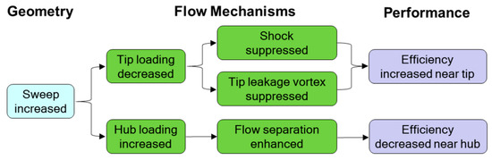 - Sweep influences the flowfields through the effects on the front loading, the shock structure, the tip leakage vortex, and the flow separation. On the shroud section, forward sweep tends to restrict the front loading, the shock strength and the tip leakage vortex, which reduces the loss near the casing. On the hub section, aft sweep suppresses the front loading and the flow separation, which reduces the loss near the hub.