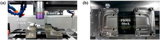 This study focused on the fabrication of microfluidic channels for DNA distribution using femtosecond laser micro-scribing in PDMS (Sylgard 184 silicone elastomer kit; Dow Corning, Midland, MI, USA). To prepare a PDMS block (length × width × thickness of 75 mm × 25 mm × 5 mm) for femtosecond laser ablation, the silicone elastomer was mixed with the curing agent at a ratio of 10:1. The mixed silicone elastomer was poured into a glass petri dish, placed in a vacuum desiccator (DURAN Group GmbH, Mainz, Germany) to degas the PDMS for 20 min, and then cured in an oven at 80 °C for 1 h.