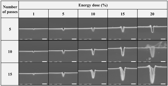 A 5-mm thick PDMS block was placed on the jig for micro-scribing in an unenclosed environment, as shown in Figure 1a. To find the exact location of the top surface, the sample was scanned using the focal distance of the attenuated beam in the z-direction. A two-dimensional channel drawing was loaded into the laser system, and laser micro-scribing was performed. To investigate the geometric characteristics of the micro-channels, the PDMS samples were ablated with various laser intensities according to the energy doses of 1%, 5%, 10%, 15% and 20% of the energy peak (Table 1). For each energy dose, the process was performed with 5, 10 and 15 laser beam passes. After the laser micro-scribing, the samples were cross-sectioned using a razor blade. The cross-sectioned surface was sputter-coated with Pt, and then the geometric features were observed using a field-emission scanning electron microscope (FE-SEM; SUPRA 40VP, Carl Zeiss AG, Oberkochen, Germany). The experiments were repeated three times to confirm reproducibility.