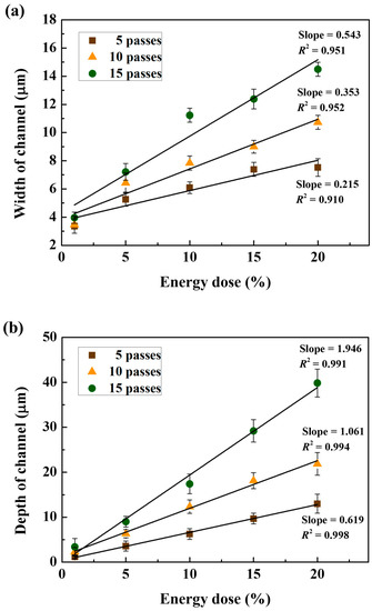 In Figure 3b, the width at 5 laser beam passes linearly increased from 3.36 ± 0.51 to 7.52 ± 0.63 μm when the energy dose increased from 1 to 20%. The slope, the ratio of the channel width to the energy dose, at 5 laser beam passes was 0.215 (R2 = 0.910). The change in the channel width was smaller than that of the depth of the micro-channels due to the Gaussian distribution and straight laser beam. The slopes at 10 and 15 laser beam passes were 1.6 and 2.5 times greater than the slope at 5 laser beam passes, respectively, due to the analysis previously discussed for Figure 3a.
