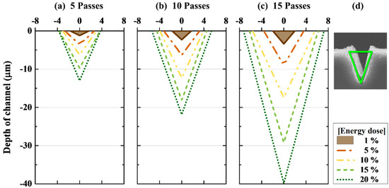 Figure 3a,b show the measured depth and width of the micro-channels using SEM images, respectively. Overall, the depth and width of the micro-channels were proportional to the energy dose and number of laser beam passes. In Figure 3a, the depth at five laser beam passes linearly increased from 1.20 ± 0.40 to 12.99 ± 2.12 μm when the energy dose changed from 1 to 20%. The slope, the ratio of the channel depth to the energy dose, at five laser beam passes was 0.619 (R2 = 0.998). The slopes at 10 and 15 laser beam passes were 1.7 and 3 times greater the slope at five laser beam passes, respectively. Even though the energy dose increased equally, a nonlinear accumulation of total thermal energy could occur as the laser beam passes were repeated.