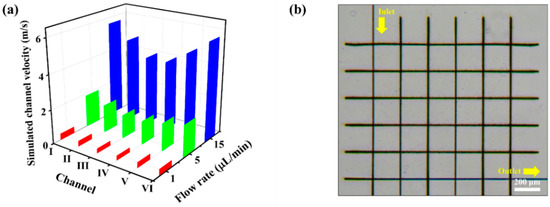The parameters and u are the density and velocity vector, respectively. The parameter F is the volume force vector, and p is the pressure. The dynamic viscosity, μ, was constant at 0.001 Pa s. The flow was laminar with no slip conditions on the wall. The computer-aided simulation was conducted with inlet flow rates of 1, 5 and 15 /min. To obtain smooth results, second-order Lagrangian mesh elements were applied, and a mesh optimization was conducted until the results converged to less than 0.1% error. After the numerical analysis was completed, the cross-section of the micro-channel was cut and the velocity distribution on the 2D surface was analyzed. In addition, the average velocity for each channel section was calculated at different flow rates.