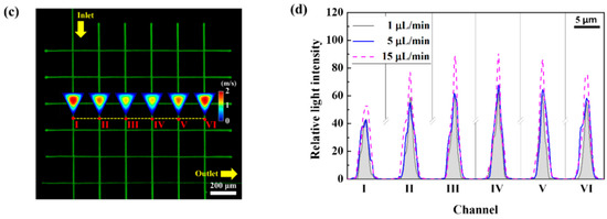 Simulated and experimental results of a microfluidic DNA distributor. Image (a) shows the simulated channel velocity at various flow rates (1, 5 and 15 μL/min); Image (b) shows the DNA distributor fabricated at an energy dose of 5% and a laser beam pass of 5; Image (c) shows a fluorescent image of DNA flowing at various channels with the simulated cross-sectional velocity; and (d) shows the characterization of the relative light intensity for YOYO-1 DNA according to the dotted line profile in (c) with various flow rates in the micro-channels.