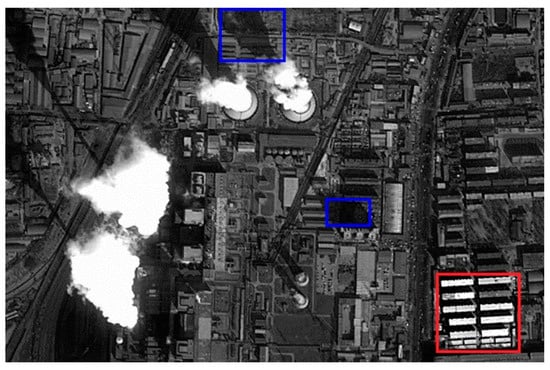 Researchers have always pursued high-dynamic-range imaging (HDRI) of the remote sensing camera, regardless of using CCDs or CMOSs as the image sensors [6,7,8,9,10,11,12]. The reason is that the reflectivity of different targets on the ground varies greatly. For example, the strong contrast between the roof and the shadow-covered area of a high building may cause the irradiance span to surpass the dynamic range of camera. This may cause the low brightness targets to be drowned out by noise. The high brightness targets may make the corresponding pixels reach saturation or even overflow. An example is shown in Figure 1. The roofs in the red rectangle have reached saturation, while the shadowed targets in the blue rectangles are still too dark to be seen clearly. Thus, to apply the digital TDI CMOS in remote sensing, we should perform an in-depth analysis of its information transmission model, and explore the point of penetration at which to perform effective improved methods. If handled well, these methods can help to achieve the goal of HDRI, which is of great significance.