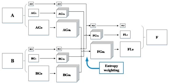 - use the entropy of sub-images in each direction on each decomposing layer to calculate with Equation (1) and name and , as the weight in order to obtain the fused gradient pyramid {}. The subimage on the l layer and in the k direction of the fused pyramid is calculated as:
