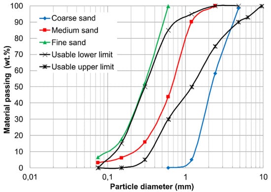 Figure 2 also shows the upper and lower limits of fine aggregate distribution for concrete production following the NBR 7211 [44] standard method. According to these limits, it can be seen that the medium granulometry curve is contained within the usual ranges, the fine CDW distribution is found to be practically at the lower limit, and the coarse distribution is found above the upper limit of natural fine aggregates used in concrete production.