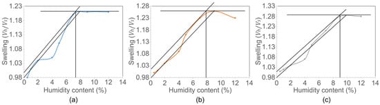 Swelling coefficient as a function of moisture content for CDW classified as (a) coarse; (b) medium; and (c) fine.