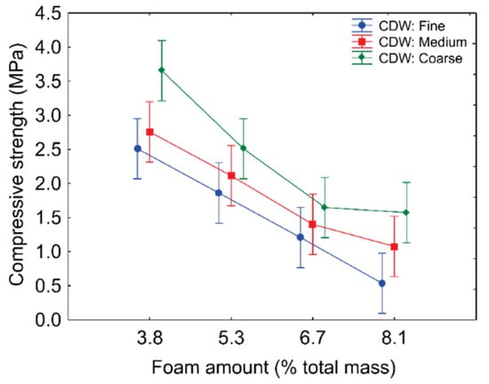 Figure 4 shows CS with respect to FA for the different granulometries. It can be seen that increasing FA reduces CS due to the incorporation of air into the mortar, which reduces its density. The specimens with coarse CDW showed higher values of CS than those with medium CDW, and those higher than fine CDW. This phenomenon can be explained; the fine-grained residue absorbs more water than coarse. The WA allows the coalescence of foam bubbles inside the mortar, and consequently, an increase in the size of the bubbles and air content, which lessens density and CS. Results are in agreement with former studies by Nambiar and Ramamurthy [50] and Haach et al. [49].
