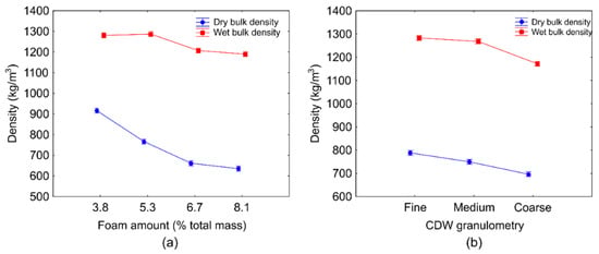 The behavior of DBD and WBD as a function of FA and CDWG can be seen in Figure 5a,b. Figure 5a shows that increasing FA in the mortar causes a nonlinear DBD decrease. The WBD was shown to be almost constant for FA variations from 3.8% to 5.5% and from 6.7% to 8.1%. However, there was a decrease in WBD with an FA increase from 5.3% to 6.7%. Figure 5b shows that both densities (dry and saturated) decrease with an increase in CDWG. With a smaller addition of foam, the bubbles of air incorporated gather by dehydration, creating larger bubbles. These density variations occur given an increase in water content (FA increase) that makes bubbles collapse by a reduction of the hydro-lipophilic film, which makes them less resistant to the strength of the medium [52,53]. It is also due to the union of air bubbles incorporated into the mortar by dehydration; that is, it is a consequence of having CDW granulometry variation.
