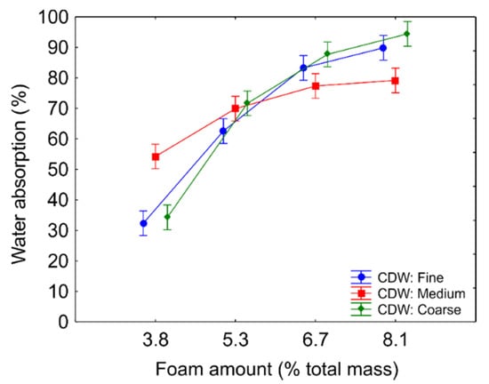 WA as a function of FA and different CDW granulometries is shown in Figure 6; increases in FA associated to increases in WA were observed. This phenomenon occurs given an increase of total AV and an increase in the connectivity between pores (higher capillarity) [23]. Curve intersections indicate that there was an interaction between FA and CDWG (factors); that is, there was different behavior in terms of WA at different levels of CDWG and FA. In this context, medium size CDW had less variation of WA than the other granulometries with an increase of FA. Nambiar and Ramamurthy [54] also found an increase in WA as a function of FA when boiler ash was used as a substitute for natural sand. However, they found different results for natural sand (water absorption decreased with an increase of foam). High WA values were found for concrete blocks made with CDW residue, where WA varied from about 30% to 90%. The variation in WA values possibly occurred due to the different capillarities found in concrete blocks.