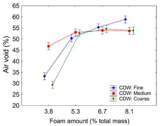 Another aspect with respect to pore sizes that can be noticed is an increase in the average D10 and D50 sizes for increases in DWG granulometry (fine: D10—52 µm, D50—347 µm; medium: D10—80 µm, D50—355 µm; coarse: D10—98 µm and D50—379 µm). For D90 changes that are not linear, medium CDW pore diameters had the smallest sizes of all fractions (D90—865 µm), which remained almost the same for fine (D90—899 µm) and coarse (D90—897 µm) fractions. Findings for D50 and D90 are in agreement with Nambiar and Ramamurthy [39] for foam volumes of 40% and 50%.