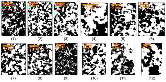 Figure 8 presents typical binary images of transversal sections of the 12 specimens in sequence, following the order of Table 2. Average porosity values were: (1) 31%; (2) 51%; (3) 55%; (4) 59%; (5) 48%; (6) 54%; (7) 53%; (8) 47%; (9) 24%; (10) 56%; (11) 54%; and (12) 53%.