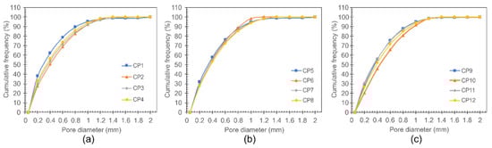 Figure 9 shows cumulative frequency as a function of average pore diameters for different amounts of foam. Figure 9a–c refer to fine, medium, and coarse CDW granulometries, respectively. Results indicate that pore sizes, which are considered to be perfect circles, showed a variation from 20 µm to 1200 µm. Based on D10, D50, and D90 (which are used to represent the mean and ranges of particle sizes), it can be stated that there was a slight increase in the diameter of pores when there was an increase in FA from 3.8% to 5.3% (D10—62 µm to 95 µm; D50—325 µm to 395 µm; D90—838 µm to 910 µm), while pore diameter remained almost constant with FA increases from 5.3% to 8.1%. Medium pore sizes were found to be: D10—80 µm; D50—372 µm; D90—903 µm.