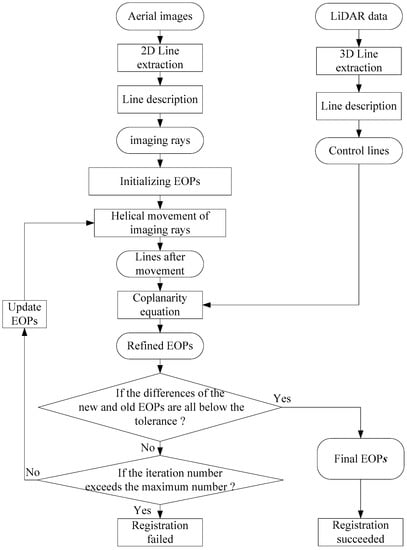 The registration based on line vectors involves two steps. The first step is, respectively performing line description and other operations. The second step is to apply the two sets of data obtained in the first step to the coplanarity equation and find the EOPs satisfying the iteration condition. The overall flow chart in this paper of registration based on line vectors is shown in Figure 1.