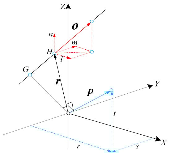 As shown in Figure 2, the unit direction vector of lines can be expressed by three direction cosines, namely , which satisfies , i.e., , but these three parameters cannot determine the position of the line. The position vector of H, an arbitrary point on the line directed by the origin is r, according to which the position of the line can be determined and line vector L can be obtained. Line vector L is a six-vector, including the primary part and secondary part. The directional vector is the primary part of the line vector, while the moment vector is the secondary part of the line vector. The directional vector does not change as the origin changes, but the moment vector does. For this reason, we know that the line vector is a vector attached to a line in the space and six-dimensional linear space in the real number field: