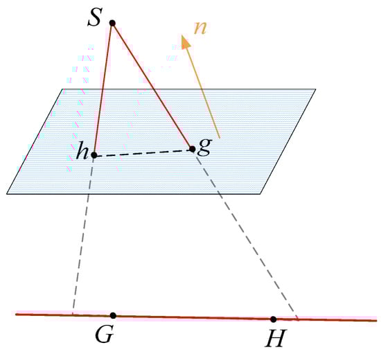 As shown in Figure 3, hg is an image feature line passing through point h and point g. Imaging ray Sh from the photographing center S runs through point h and Sg runs through point g. As a corresponding control line in LiDAR data, GH runs through point G and H. In regard to lines Sh, Sg, and GH, assume their directional vectors of are , , and O, moment vectors are , , and P, and all three lines are coplanar at photographing, then, based on Equation (4), the LiDAR data coordinate system and the image coordinate system have the following relation: