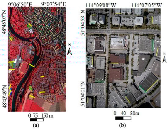 The commonly-used features in registration mainly include point features and the line features. Compared with point features, linear features have the potential to be reliably, accurately, and automatically extracted from images []. In addition, linear features are abundant and can be easily obtained in urban areas without the requirement for the line segment endpoint corresponding to the same point, allowing the linear features to be partially occluded [,,,,,].