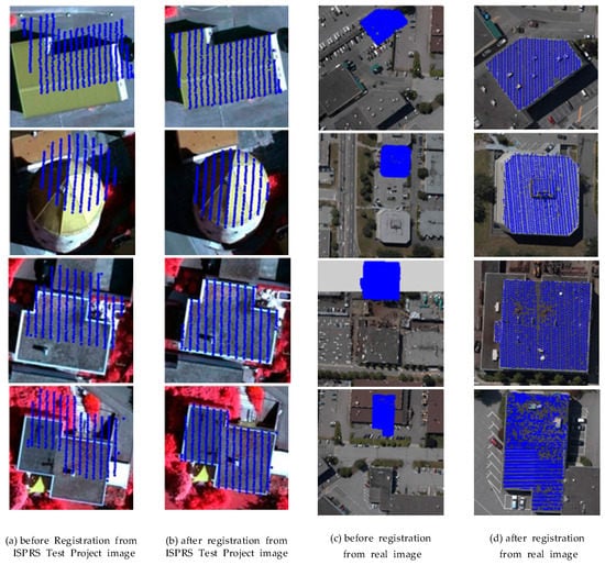 The inaccurate original EOPs before registration has resulted in large deviation in real roof positions and projecting points on the image. The registration of real roof positions and projecting points on an image has been accurately achieved after the registration of aerial images and LiDAR data. It follows that the LVR can achieve an ideal registration accuracy in urban areas with rich linear features.