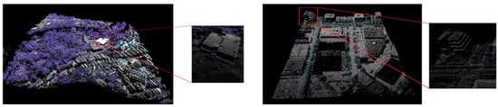 Figure 5 represents the effect on the image before and after registration. We extract the point cloud of building roofs in LiDAR data, and project the roof point cloud onto the image by the solved EOPs, where projected roof points are shown in blue. Figure 6 represents the whole and the local 3D effects of the images after registration. Since the LiDAR was pointing vertically down, the points only distribute on the roof of the building, without any distribution on the facade, and the color of the building facade is black after registration.