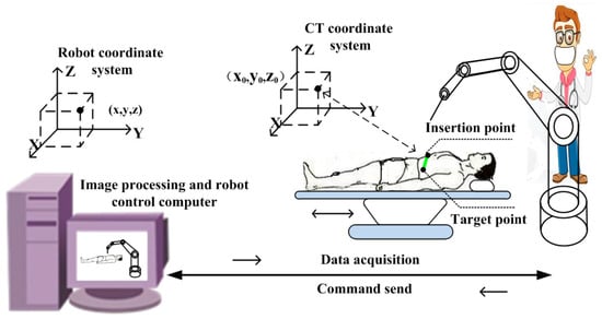 Firstly, patients require a CT scan, and the medical image will be generated by the computer to complete the three-dimensional reconstruction. Then a doctor can observe and diagnose the disease according to the three-dimensional model. Finally, the doctor determines the position of the puncture target point coordinates, and determines the insertion point through the analysis of the patients’ skin. Between the target point and insertion point of connection is the puncture route (the green line in Figure 1). The route must avoid the patient’s bones, blood vessels, and other organs. The accurate puncture route directly determines the quality of the puncturing operation. Research on precise positioning technology of the manipulator used in this study was conducted to establish the series robot puncture route. The puncture route target point and insertion point coordinates are sent to the robot through the data processing computer, and at the end-effector of the robot, the puncture guide tube accurately positions the needle into the patient’s skin, the puncture route keeping with the robot end position and posture.