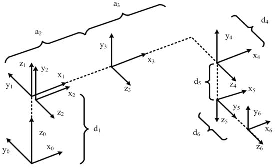 These equations can provide the robot position, which is relative to the universe coordinate system [12]. The coordinates of each joint are used to describe the position and orientation of the robot. The forward kinematics equation of the robot is described by Equation (8):