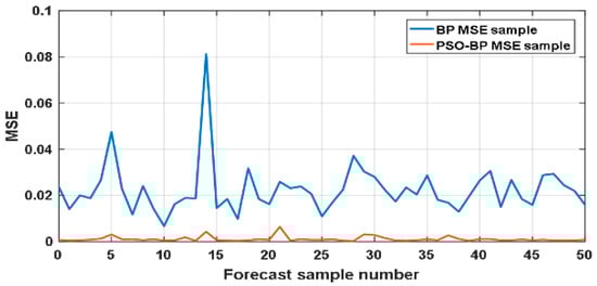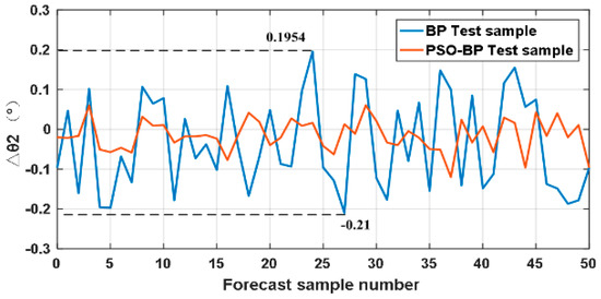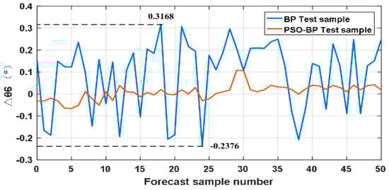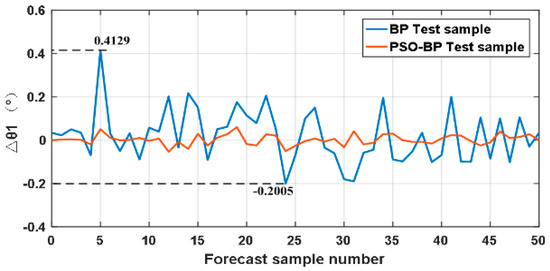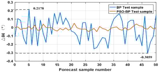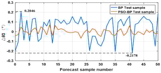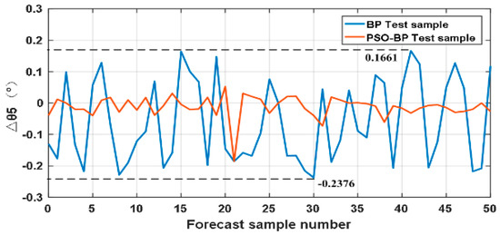 For the network after training, we get the error range of the test set and the range of the mean square error (MSE) which is shown in Table 2. The error range of 50 sets of joint angles, the error range of the joint angle by the BP neural network was calculated as [–0.3059, 0.4130], and the mean square error (MSE) was in the range of [6.72 × 10−3, 8.12 × 10−2]; the error range of the joint angles by the BP neural network-optimized PSO was calculated as [–0.1859, 0.1079], the mean square error (MSE) was in the range of [2.39 × 10−4, 6.42 × 10−3]. Figure 7, Figure 8, Figure 9, Figure 10, Figure 11 and Figure 12 show the contrast of the BP neural network, and the PSO-BP neural network for the output robot joint angle error △θ. Figure 13 is the comparison of the mean square error (MSE) of the two algorithms.