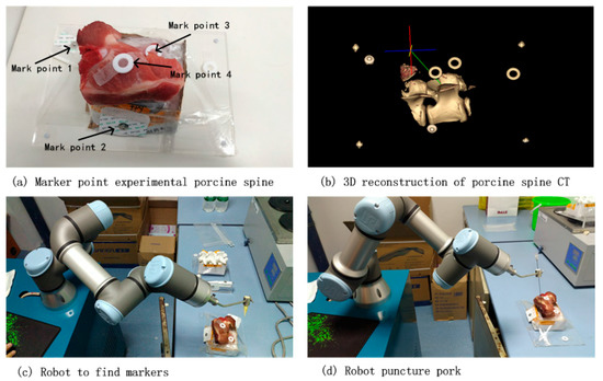 - Firstly, a piece of porcine spine meat is affixed to some fixed marked points (Figure 14a), and then the DICOM (Digital Imaging and Communications in Medicine)image is obtained by CT scanning.