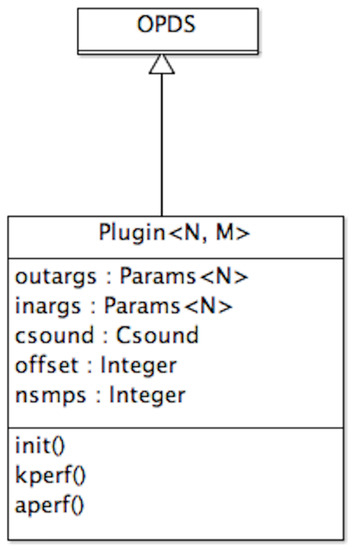 From an object-oriented (OO) perspective [8], we can observe that an opcode might be described as a class that inherits from OPDS. It will contain a variable number of argument objects (), depending on its outputs and inputs. An opcode class can define up to three public methods, one for each action time required. These methods take as a parameter the Csound engine object, which has a large number of public methods that can be used for a variety of means: to retrieve engine attributes; to print messages; to handle MIDI data; to list and retrieve lists of arguments; to perform memory allocation and management; to access function tables; to perform FFTs and handle frequency-domain data; to access disk files; to generate random numbers; to spawn threads, manage locks and circular buffers; plus a number of other miscellaneous operations.